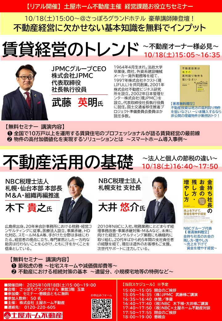 本セミナーでは、JPMCグループCEOの武藤様、NBC税理士法人の木下様、大井様をゲスト講師に迎え、賃貸経営における高付加価値化への実現についての事例や、不動産を活用した節税方法など、豊富な経験にもとづいて解説いたします。